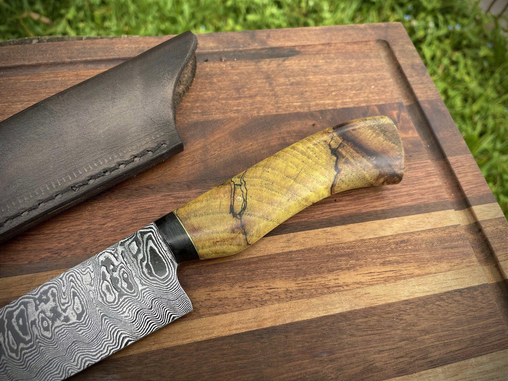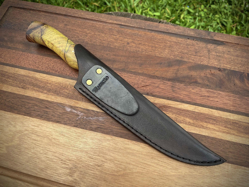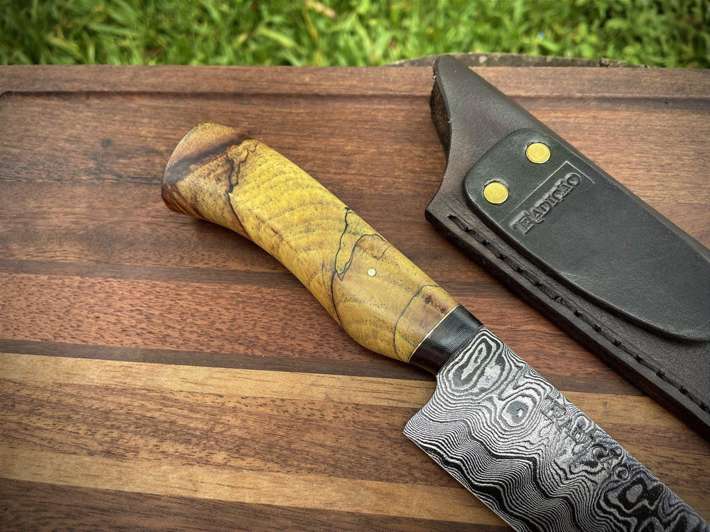Seu cabo em madeira estabilizada apresenta tons de amarelo creme com spalted em preto