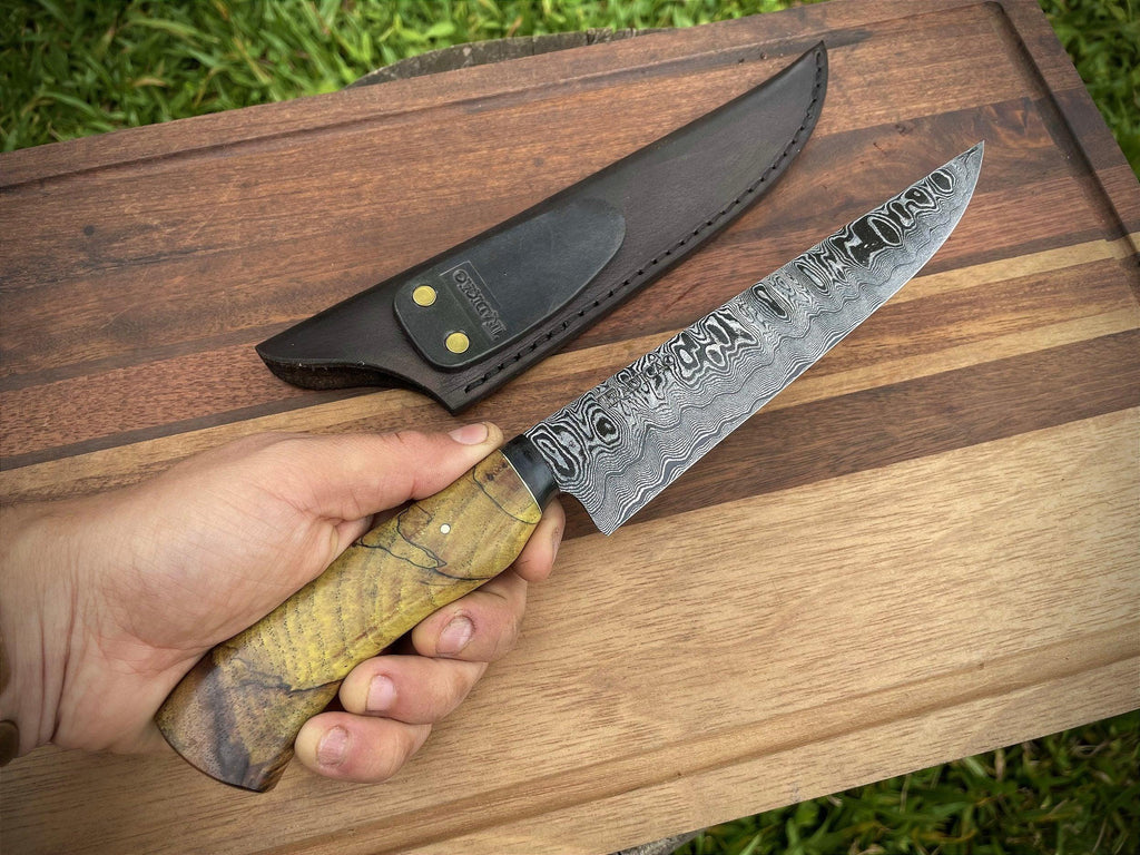 Faca estilo Churrasqueira, feita em damasco aleatório.